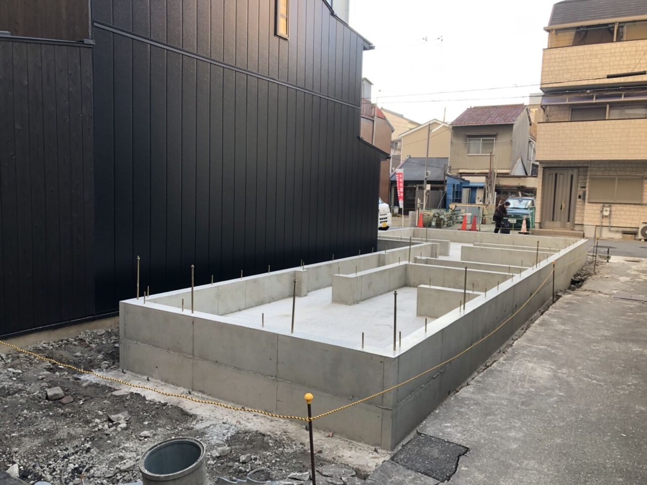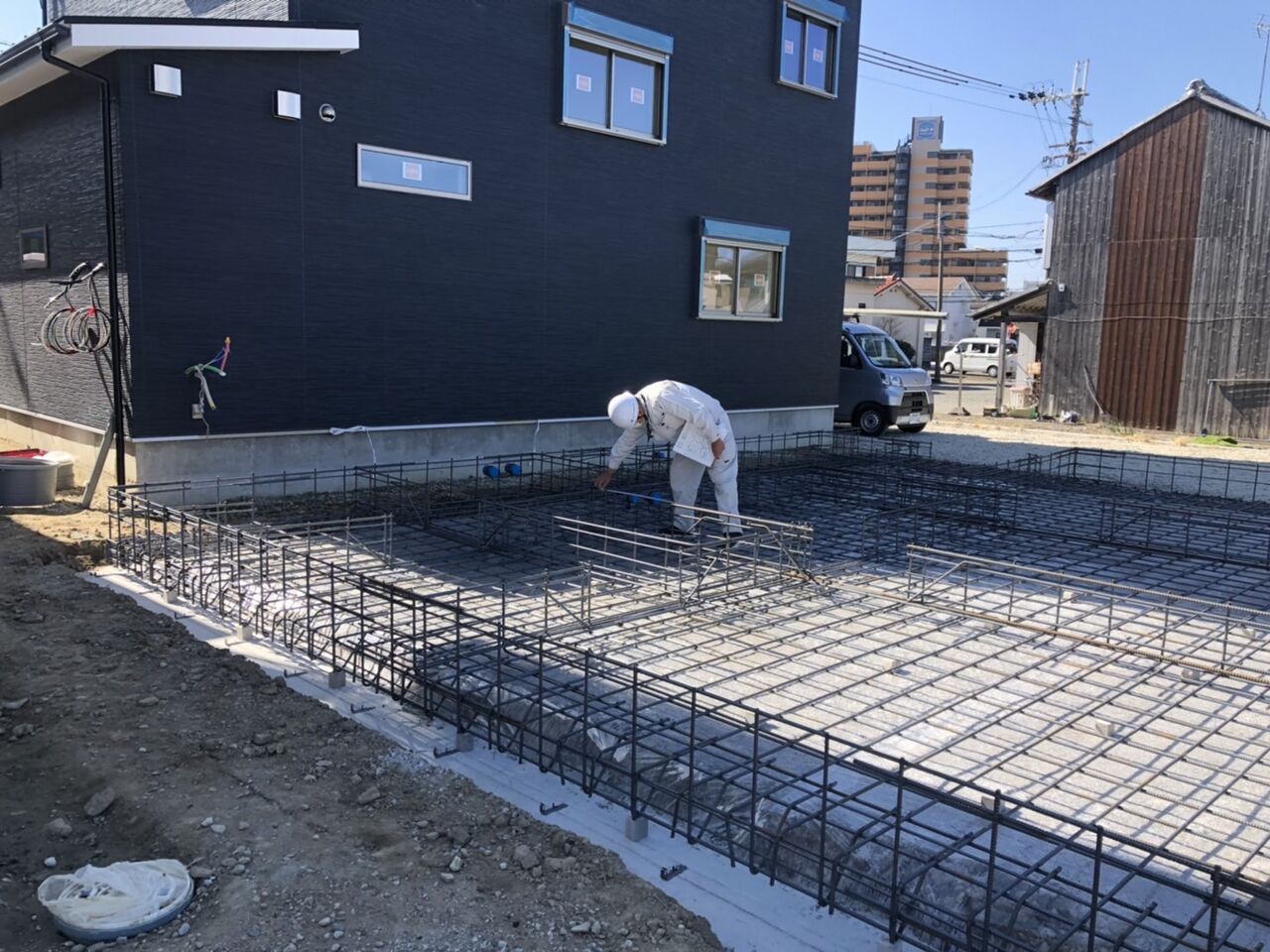 基礎配筋工事が終わりまして、検査員による検査。
