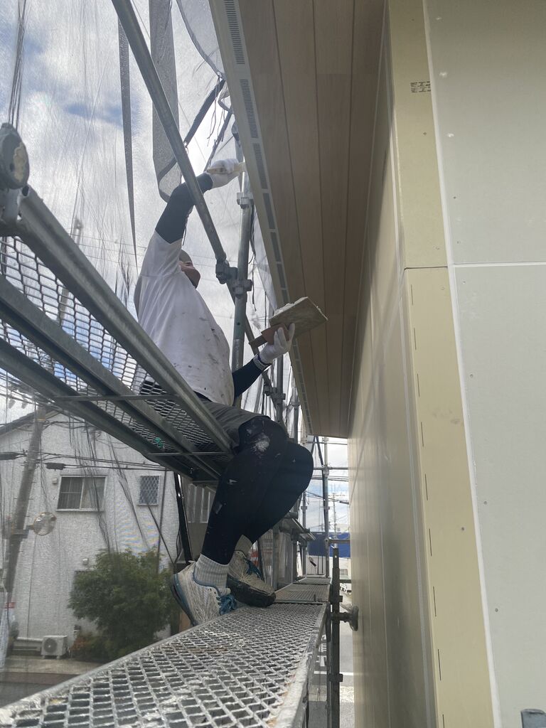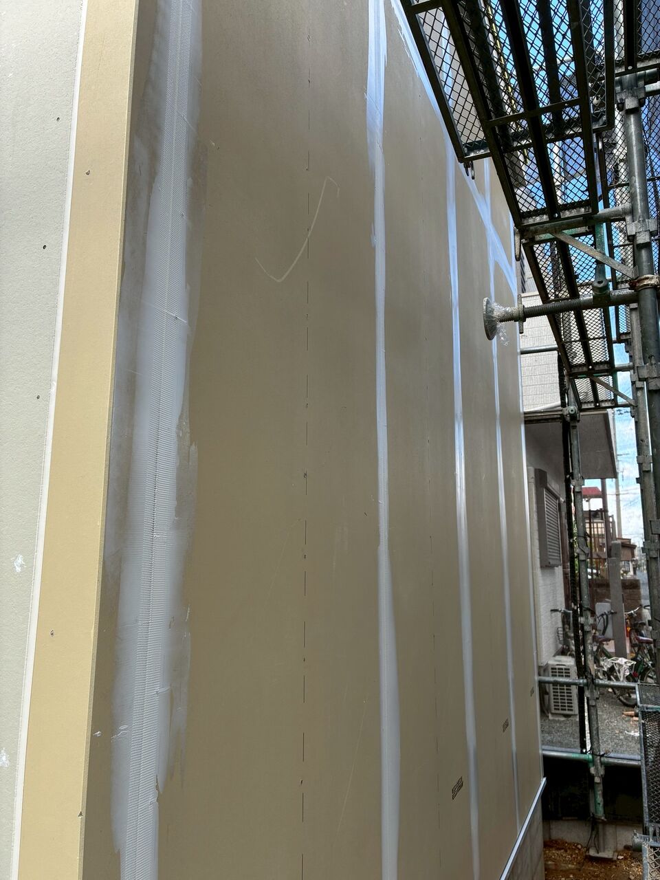 S様邸は、これから外壁の塗装が始まります。特に、家の正面にはジョリパットという塗り壁材を使い、「トラバーチン」という味わい深いテクスチャで仕上げる予定です。