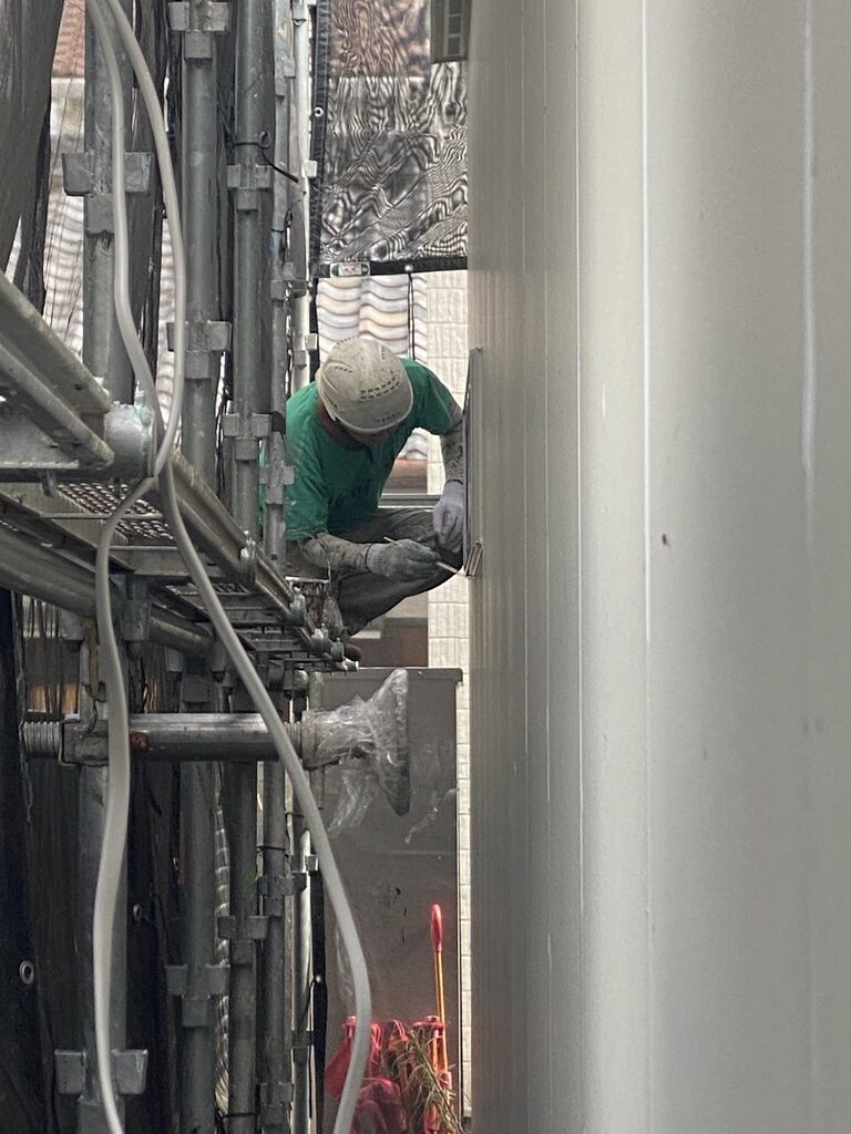 先週末で、家の外側を覆うサイディング(外壁材)の施工が終わり、本日はそのサイディングの継ぎ目などを埋めるコーキング(シーリングとも呼ばれます)の仕上げ作業が進んでいました(写真2, 3, 4)。