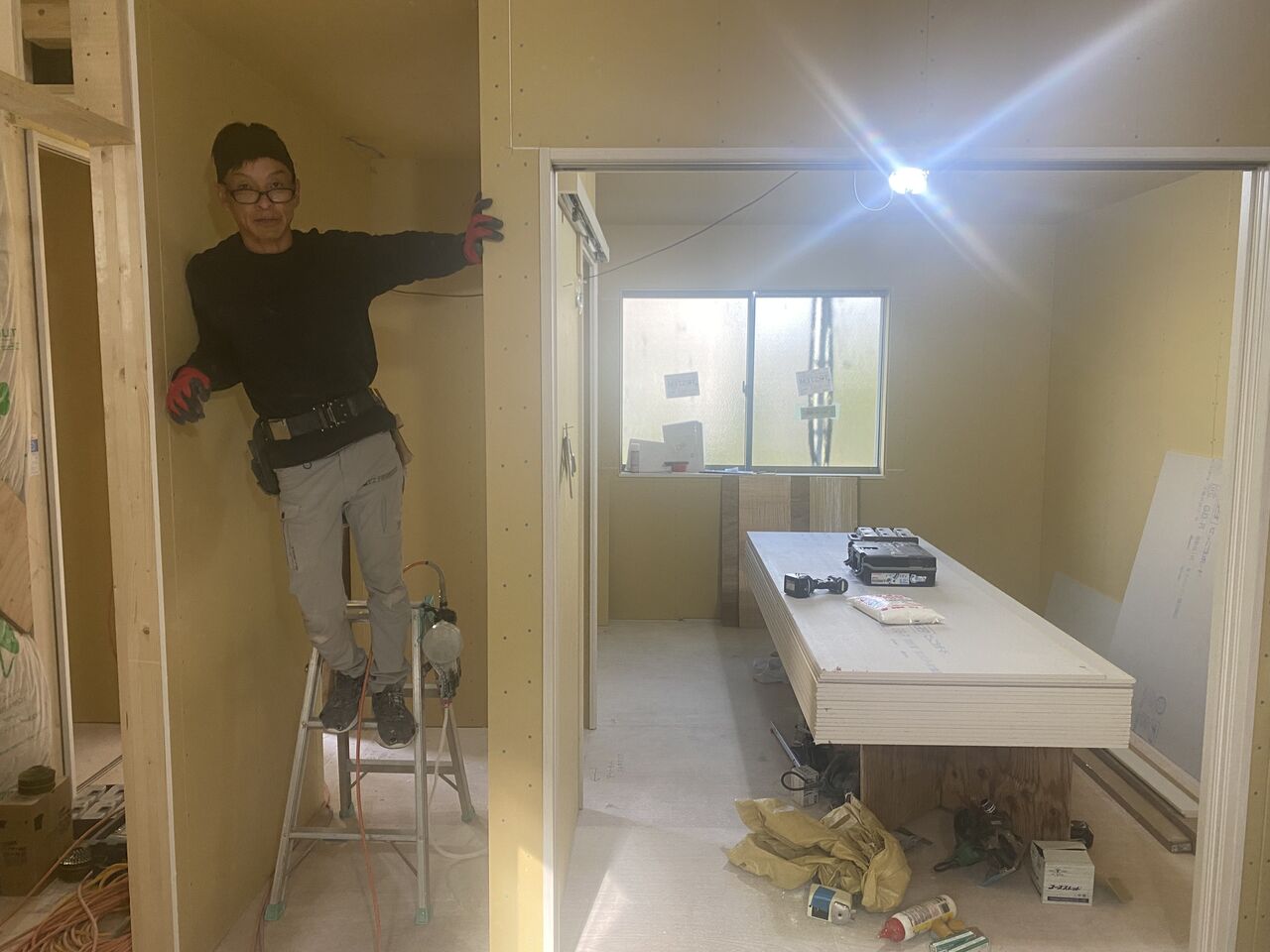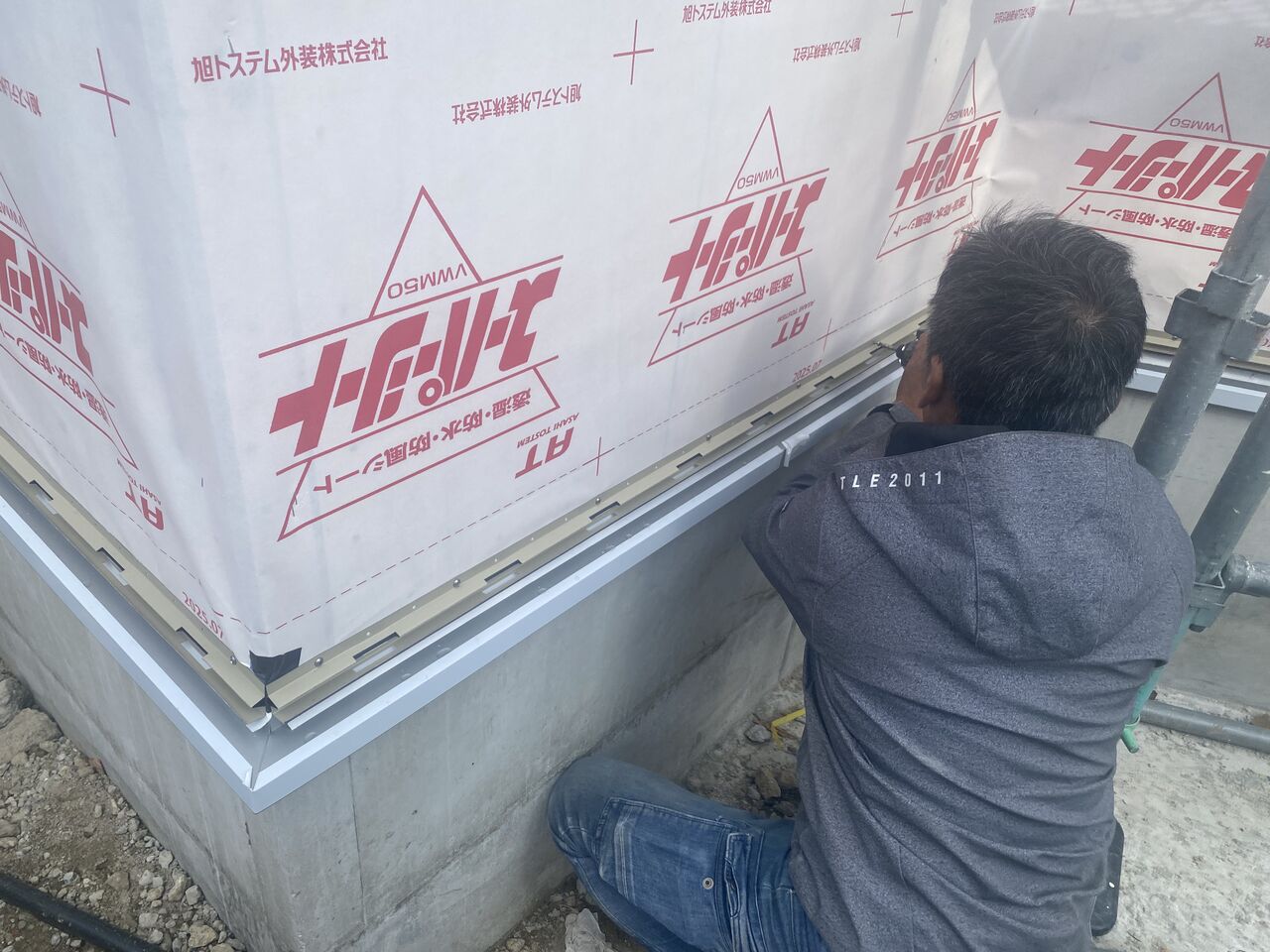 越山大工さんと、ちょうどスタートしたサイディング工事の最終確認。